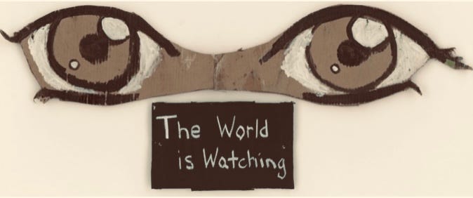 The photo below is of a creation titled “The World is Watching.”  The artist is not known. It is located at the Library of Congress which has a long history of collecting Protest Art and Protest Photography. Visually stunning and a reminder that protests and activism change with the technology of the times.