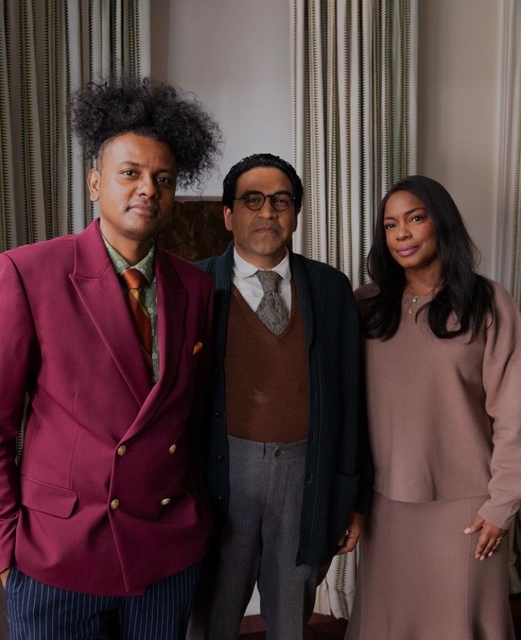 Dr. Suraj Yengde (as “himself”), Dr. Gaurav J. Pathania (as “Dr. Bhimrao Ambedkar”) and Aunjanue Ellis-Taylor (as “Isabel Wilkerson”) in Ava DuVernay’s film “ORIGIN.”